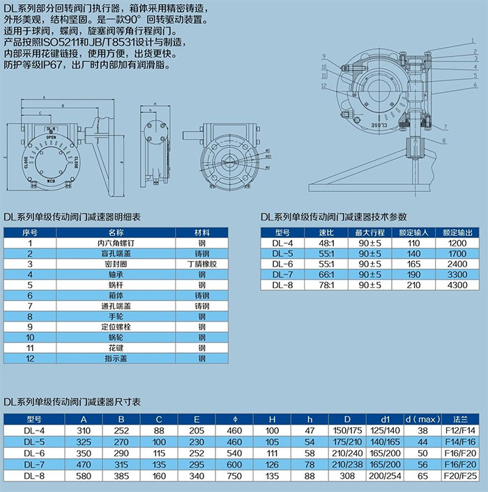 DL系列部分回轉(zhuǎn)閥門執(zhí)行器,殼體采用WCB鑄造,蝸輪采用QT500-7,蝸桿使用45鋼調(diào)質(zhì),蝸桿軸支撐使用圓錐滾子軸承更科學(xué)。適用于球閥、蝶閥、旋塞閥等角行程閥門。產(chǎn)品按照ISO5211和JB/T8531設(shè)計(jì)、制造與檢驗(yàn)。蝸輪與軸套采用花鍵連接,使用方便,出貨更快。產(chǎn)品防護(hù)等級有IP65,具有90±5°調(diào)節(jié)功能。